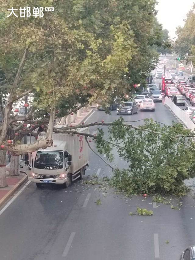 中华大街万达商厦北侧,一厢式货车与行道树相蹭,北往南行车受阻,过往司机注意安全。
