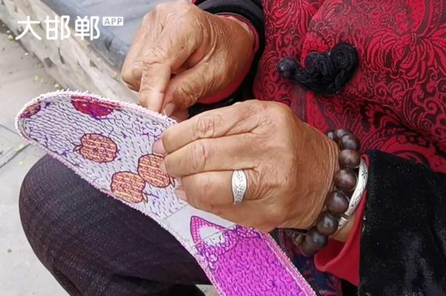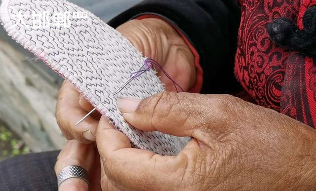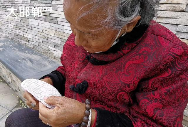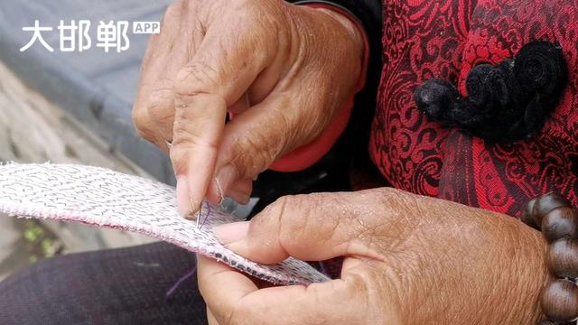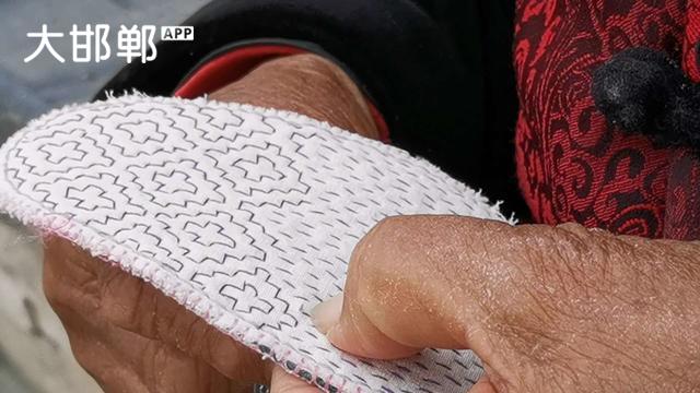 在邯郸沁河岸边,看到一位老妈妈在一针一线的纳鞋垫,这才是真正的纯手工制作的鞋垫。