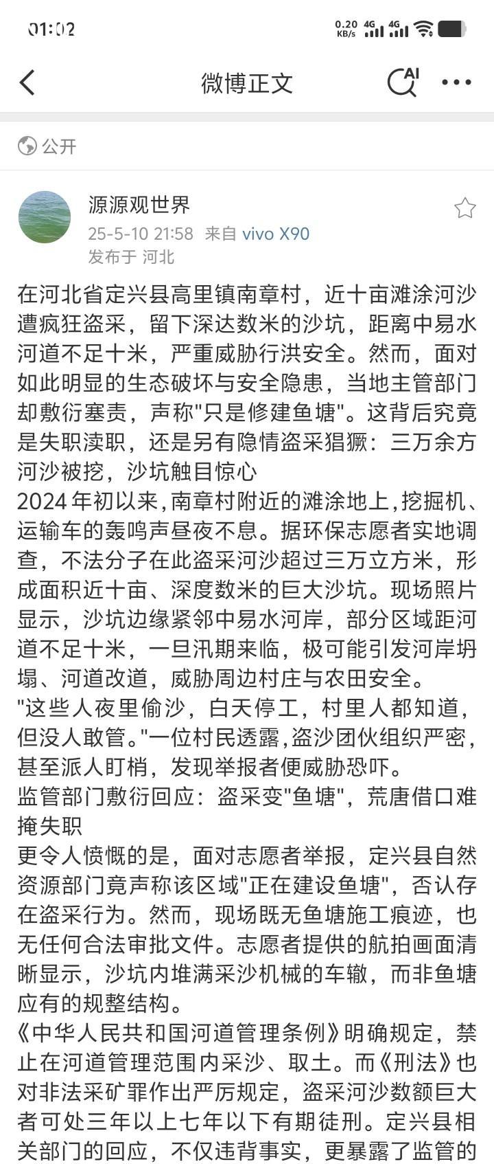 "这些人夜里偷沙,白天停工,村里人都知道,但没人敢管。"一位村民透露,盗沙团伙组织严密,甚至派人盯梢,发现举报者便威胁恐吓。 监管部门敷衍回应:盗采变"鱼塘",荒唐借口难掩失职更令人愤慨的是,面对村民的举报,定兴县自然资源部门竟声称该区域"正在建设鱼塘",否认存在盗采行为。