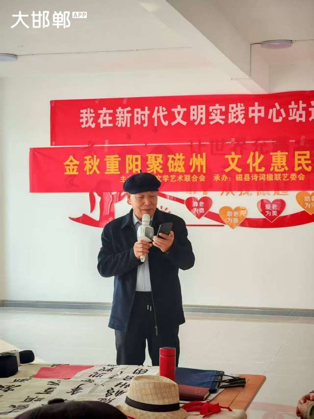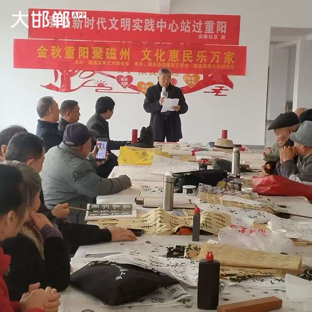 金秋送爽,菊花芬芳,丹桂飘香。在乙巳年重阳节来临之际,10月26日上午,磁县诗词楹联协会,磁县民俗研究社、磁县书画院,在磁州书画院共同举办“金秋重阳聚磁州,文化惠民乐万家”联欢活动。来自全县诗词楹联协会和磁州书画院的三十名位诗人、作家,书画名家齐聚一堂,共同欢度乙巳年重阳佳节。 上午9时30分,磁县诗词楹联协会秘书长上台主持,宣布重阳节联欢活动开始,诗词楹联协会主席乔书堂发表了热情洋溢的致辞,自此,活动拉开了序幕。 在秘书长吴志刚的主持下,整个活动在充满喜庆欢乐的气氛中有序进行。诗词协会十几位优秀诗人、作家相继登台朗诵各自带来的原创诗词作品。 协会主席乔书堂、秘书长吴志刚的声情并茂,激情彭湃的朗诵将活动推向高潮。活动期间磁州书画院的十几位书法名家登台展示了自己的书法作品。 这次重阳节联欢活动,磁县的诗人、作家、书法家们以其优秀作品,各自以不同的内容,不同的艺术表现形式,多角度,全方位展示了自己的才艺,讴歌了磁县的新发展、新变化、新面貌。 九九重阳,暖意浓。大家以诗情、书艺讴歌新时代,抒发了大家对磁州的热爱,对天下老人的敬仰!对美好生活的追求和向往!