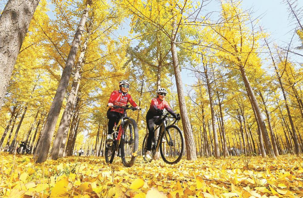 游客在曲周县经济开发区银杏种植基地骑行。 邯郸日报记者 郝群英 摄