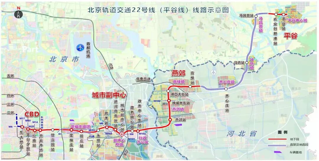 北京轨道交通22号线(平谷线)全长约81.2公里,分为北京段和河北段,共有22座车站。其中,河北段工程全长约31.56公里,共设5站6区间,齐心庄站为高架站,燕郊站、神威大街站、潮白大街站、高楼站为地下站。