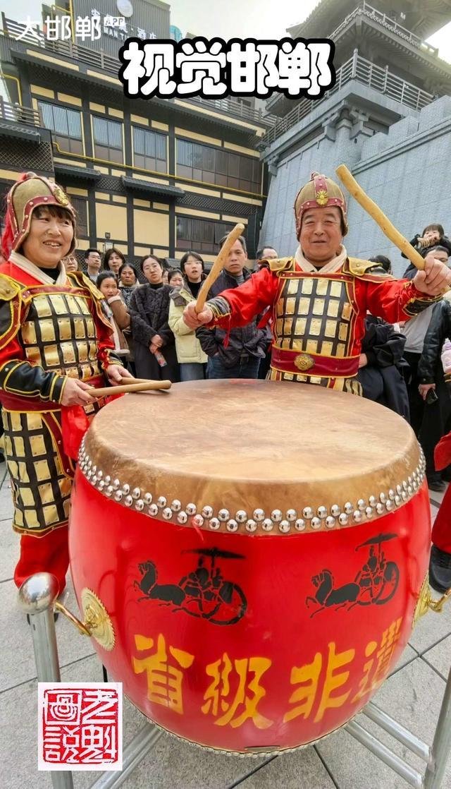 邯道赵王阁广场省级非遗“赵奢战鼓”,红鼓震天。两位身着仿战国铠甲的老者,手持鼓槌,意气风发。鼓身朱红,绘有车马纹饰,“省级非遗”四字熠熠生辉。 围观人群驻足,目光追随着鼓槌起落,铿锵节奏里,是千年赵都的风骨,是燕赵儿女的豪情。这面老鼓,敲出了市井烟火,也敲出了文化传承的滚烫力量。